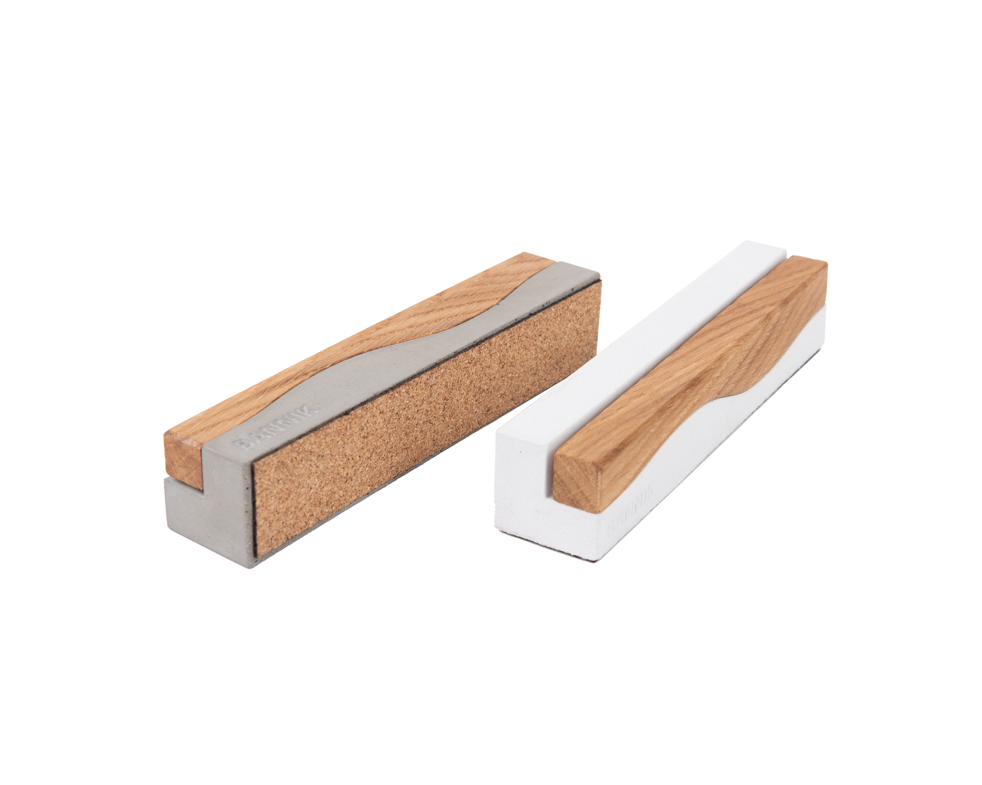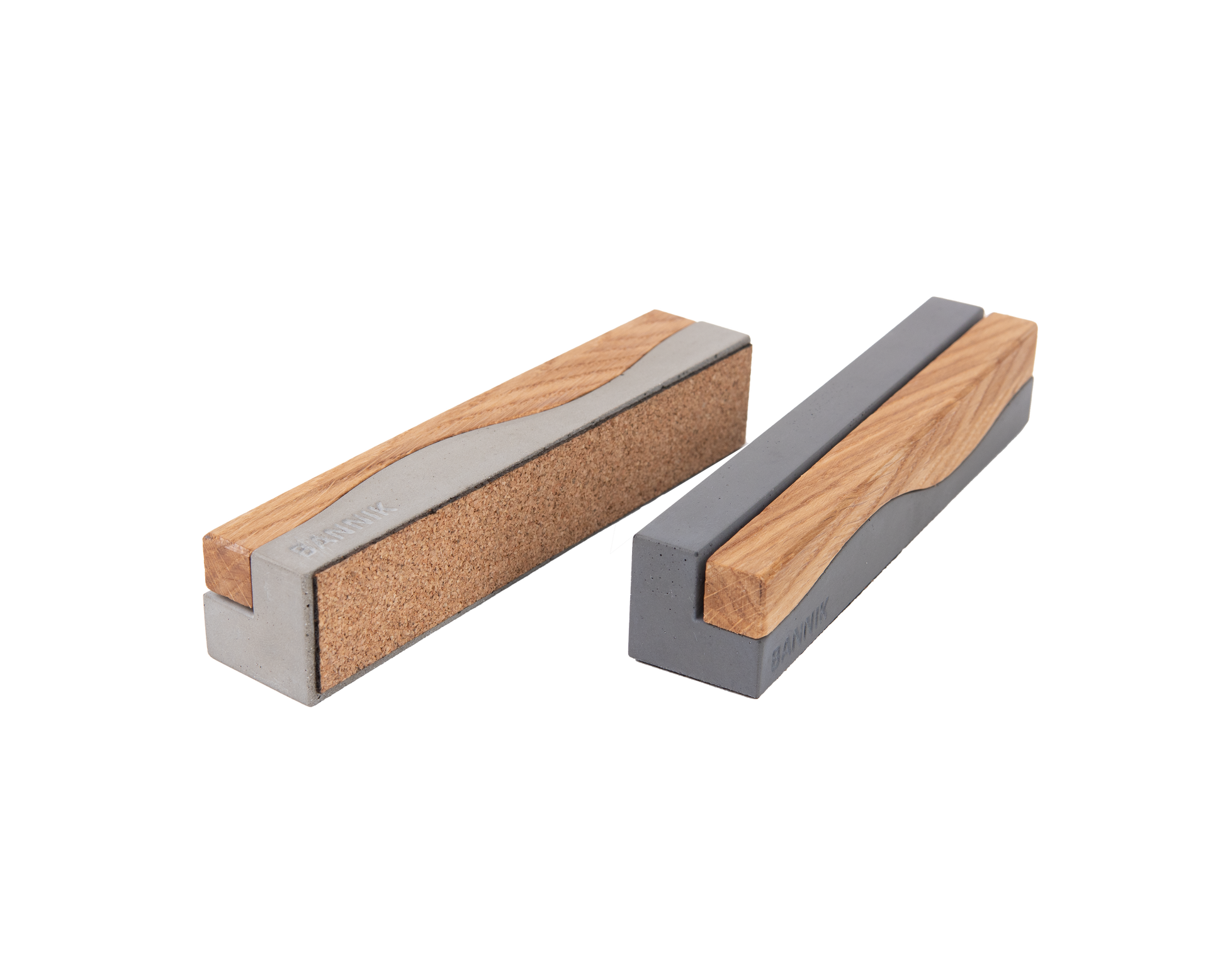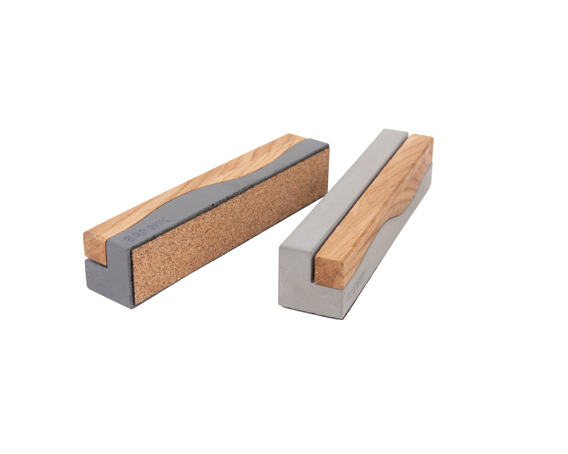 Die Unterseite ist mit Kork versehen, der Oberflächen zuverlässig vor Kratzern schützt. Jedes Stück wird in liebevoller Handarbeit gegossen, geschliffen und mit präzise eingearbeiteten Holzelementen versehen – für ein langlebiges und hochwertiges Produkt.